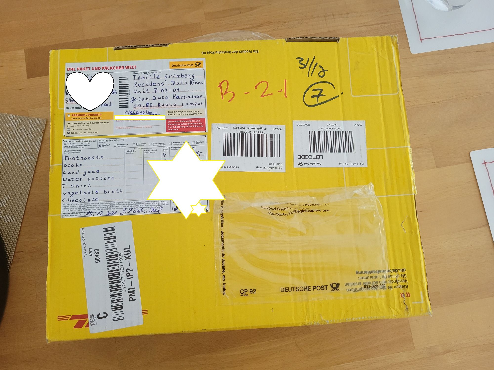 Am Silvestertag durften wir uns dann über das erste Paket von Ursulas Familie aus Deutschland freuen. Neben Zahnpasta (Elmex für Kinder kostet hier 8€), Gemüsebrühe und noch Geburstagsgeschenke für Lars waren auch noch Schokolade und andere Überaschungen im Paket. VIELEN, VIELEN DANK!